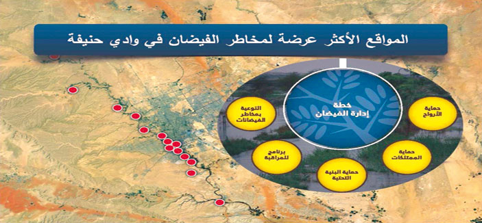 وتابع المهندس إبراهيم السلطان، بأن الاجتماع اعتمد خطة إدارة الفيضان في وادي حنيفة، التي وضعتها الهيئة العليا ضمن إجراءاتها لاستكمال منظومة الإدارة المتكاملة للوادي بالتنسيق مع الجهات المعنية، وتعمل الخطة على الحدِّ من الأضرار التي تنتج عن الفيضان أثناء مواسم الأمطار، وتأتي استجابة للتغيرات المناخية التي حدثت مؤخراً، والتي أدت إلى تزايد احتمال تعرّض المناطق الواقعة في الوادي وفروعه لمخاطر الفيضانات.
