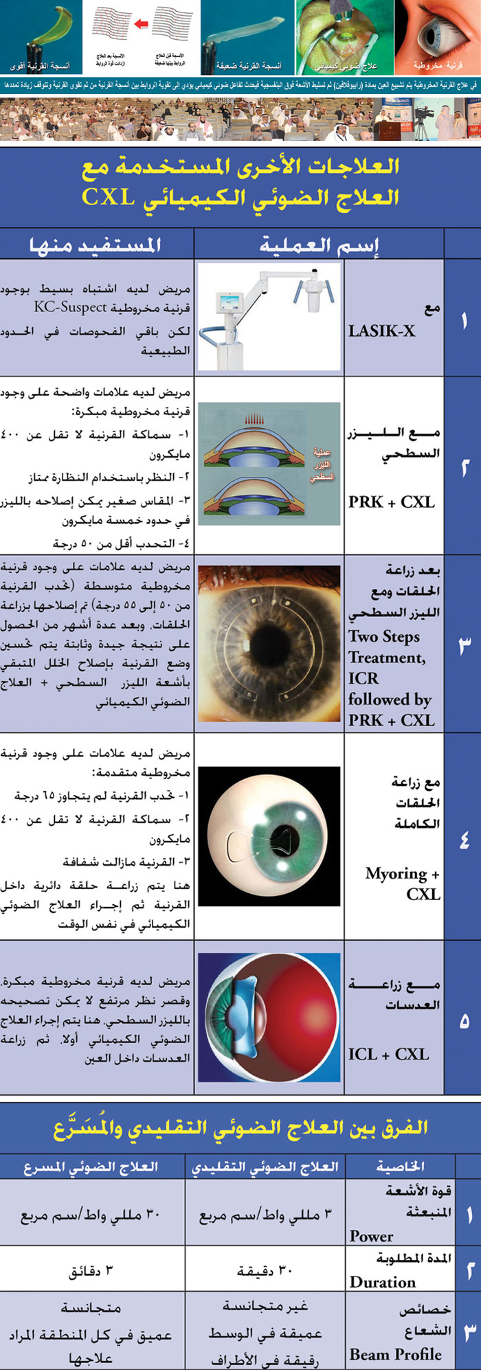 وقد تناول هذا الملتقى عدة محاور للعلاج الضوئي الكيميائي للقرنية المخروطية والتي يعمل على تثبيت تمدد وتدهور حالة القرنية المخروطية، بالإضافة إلى دمج هذه الطريقة مع الطرق الأخرى المختلفة لعلاج القرنية المخروطية - التي يعاني منها قطاع عريض من مرضى العيون - مثل العلاج بالليزر السطحي، وزراعة حلقات القرنية، وزراعة العدسات داخل العين.