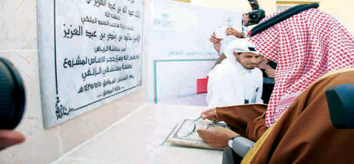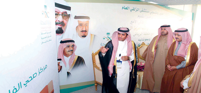 دشن صاحب السمو الملكي الأمير خالد بن بندر بن عبد العزيز أمير منطقة الرياض وبحضور سمو نائبه صاحب السمو الملكي الأمير تركي بن عبد الله بن عبد العزيز حفظهما الله ومدير عام الشئون الصحية في منطقة الرياض الدكتور عدنان العبد الكريم صباح أمس في مقر مستشفى الزلفي عدد من المشاريع الصحية الجديدة وكان في استقبال سموه الكريم ومرافقيه لدى وصوله مقر المستشفى محافظ الزلفي الأستاذ فيحان بن لبده ومدير المستشفى الأخصائي ناصر الصافي وعدد من المسئولين حيث تشرف الحضور بالسلام على سموه وسمو نائبه وبعد استراحة قصيرة قام سمو الأمير بتدشين افتتاح المراكز الصحية النموذجية الجديدة والتي تأتي ضمن مكرمة خادم الحرمين الشريفين حفظه الله ورعاه وهي مراكز ( حي القدس وحي اليمامة وحي اليرموك ومركز علقة ) وكذلك وحدة الرنين المغناطيسي وتطوير قسم الأشعة وسكن العاملين في المستشفى كما قام سموه حفظه الله بوضع حجر الأساس لمشرع توسعة المستشفى وذلك بسعة 64 سريرا ضمن المشاريع التطويرية التي تقوم بها وزارة الصحة لدعم القطاع الصحي في المحافظة بعد ذلك غادر سموه الكريم مقر المستشفى مودعا ومرافقيه بالحفاوة والتكريم.