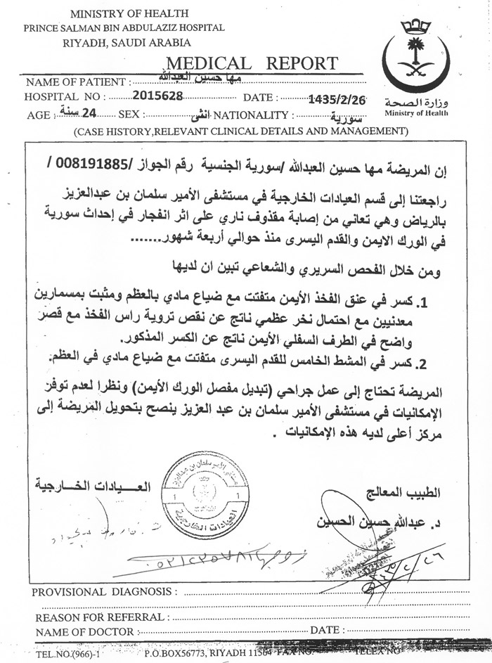 منذ عودتها من سوريا ومها حسين العبدالله تعاني من إصابة بالغة نتيجة تعرضها لمقذوف ناري في الحرب المستعرة في أرض الشام. وبعد وصولها إلى الرياض راجعت مها عدة مستشفيات أكدت بعد فحصها وجود كسر في عنق الفخذ الأيمن وكسر في مشط القدم اليسرى وهو ما يعني حاجتها إلى عمل جراحي بتبديل مفصل الورك وتجبير كسر المشط.