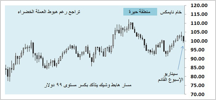 تمكَّن خام نايمكس من التداول عند مستوى 105.22 دولار، لكنه لم يصمد؛ إذ واجه بيوعاً قوية، أرغمت تجاره على الهبوط والإغلاق عند مستوى 102.58 دولار، وإنهاء الأسبوع بنمط متوازن، وتحول الاتجاه من صاعد إلى منطقة حيرة قد تجر نايمكس إلى مستوى 99 دولاراً. وكان هذا الضعف رغم تراجع الدولار وكسره مستوى 80 أمام سلة عملاته، وارتفاع الذهب إلى مستوى 1350 دولاراً للأونصة، لكن مع ذلك لم ترتفع شهية التجار في السوق.