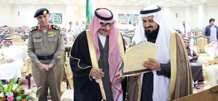 بعد ذلك شرّف سموه الحفل الخطابي، حيث أنشد خلاله مجموعة من طلاب المدارس النشيد الوطني، ثمَّ بدأت مسيرة الطلاب المتفوقين، ثمَّ ألقى الأستاذ القريشي، كلمة بالمناسبة، بعدها ألقيت كلمة الطلاب المتفوقين، ثمَّ ألقى مجموعة من الطلاب أوبريتًا وطنيًّا، بعد ذلك تشرّف مدير عام التربية والتَّعليم بالمنطقة بتقديم درع تذكاري لسموه بهذه المناسبة، التقطت بعدها الصُّور التذكارية للطلاب المتفوقين مع سموه.