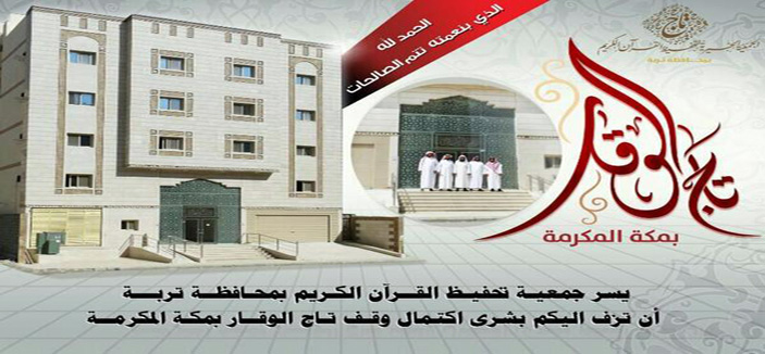 أنهت جمعية «تاج» لتحفيظ القرآن الكريم بمحافظة تربة، إنشاء مبنى وقف «تاج الوقار» بمكة المكرمة، بتكلفة تجاوزت اربعة ملايين ريال، ويُعَد هذا العمل نقلة نوعية غير مسبوقة في تاريخ الجمعية منذ تأسيسها.
