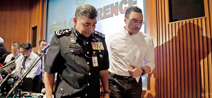 - وزير الدفاع الماليزي و وزير النقلِ بالوكالةِ ورئيس شرطة ماليزيا خالد أبو بكر بعد الانتهاء من المؤتمر الصحفي في فندق قُرْب مطارِ كوالالمبور الدولي للحديث عن آخر التطورات المتعلقة بالطائرة المفقودة ... أ ف ب