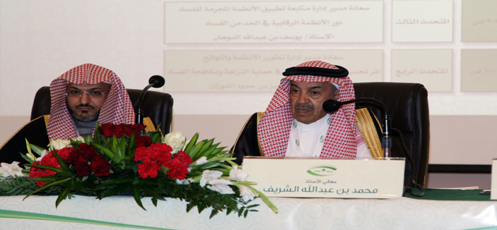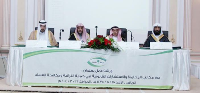 ثم ألقى معالي وكيل وزارة العدل كلمة أشار فيها إلى إن مكافحة الفساد وحماية المال العام تتطلب تضافر الجهود من كل فئات المجتمع من مواطنين ومسؤولين، إذ إن الآثار المترتبة على الفساد بكل صوره كبيرة وتمثل عائقاً أساسياً للتنمية وتبديداً للموارد والثروات الاقتصادية بل إن استشراؤه يؤدي إلى انهيار شديد في البيئة الاجتماعية والثقافية ويضع إلى جانب ذلك أجيالاً يتسرب إلى نفوسها اليأس وفقدان الثقة، وضعف الانتماء، وهو إلى جانب ذلك أحد أسباب الجرائم بكل أنواعها، وأن القطاع العام والخاص يتشاركان في مسؤولية واحدة مع تعدد أدوارهم ومهامهم كل فيما يخصه فيما يحقق الصالح العام والتعاون فيما بينهم في دعم النزاهة ومكافحة الفساد الذي هو عدو التنمية والتطوير والفساد بصنفيه الإداري أو المالي، هو ضد الإصلاح، وهو خروج عن الشرع والنظام وإخلال بواجباتهما وعدم الالتزام بمبادئهما من أجل تحقيق مصالح سياسية أو اقتصادية أو اجتماعية لفردٍ أو جماعة معينة، والالتزام بأحكام الشريعة الإسلامية في منع مظاهر الفساد ومعاقبة المفسدين مبدأ إسلامي عظيم، وما تحريم الغلول والرشوة والغش والاختلاس والتزوير وتبديد المال العام وغيرها من صور الفساد إلا دليل على ذلك. ثم توالت محاور الورشة في إلقاء الضوء على دور الأنظمة الرقابية في الحد من الفساد، وأثر تحديث وتطوير الأنظمة في حماية النزاهة ومكافحة الفساد، تلا ذلك عرض لدور مكاتب المحاماة والاستشارات القانونية في حماية النزاهة ومكافحة الفساد والمقترحات التطويرية للأنظمة الرقابية.