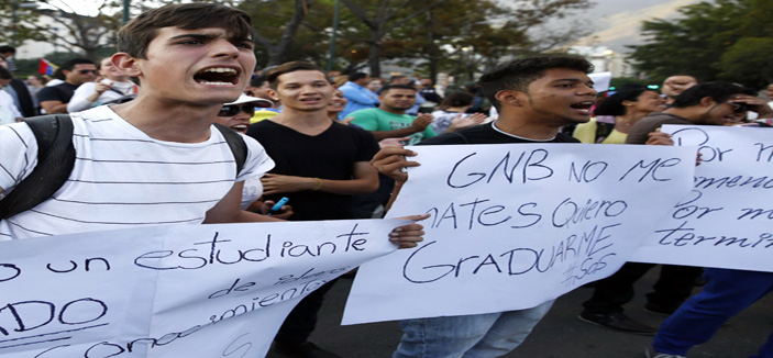 - أعلن الجيش أن ضابطا بالحرس الوطني الفنزويلي توفي، بعد أن أصيب بالرصاص في رأسه أثناء مظاهرة ليرتفع عدد ضحايا الاشتباكات بين المحتجين وقوات الأمن إلى 29 قتيلاً .. أ ف ب