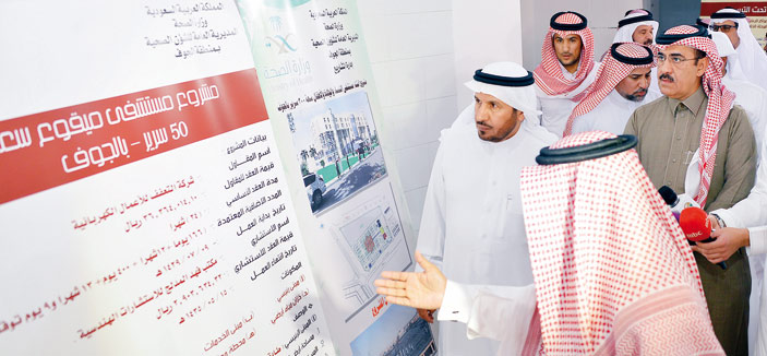 بعدها زار معالي وزير الصحة مشروع إنشاء المختبر الإقليمي وبنك الدم ومركز السموم المقام داخل مستشفى الملك عبد العزيز التخصصي الذي يحتل مساحة إجمالية قدرها مليونا متر مربع، وتَمَّ إنشاء بتكلفة قدرها 044ر830ر62 ريالاً، وبدأ العمل فيه عام 1433هـ وسينتهي بإذن الله عام 1436هـ. وشاهد معاليه مختبرات الدم، والكيمياء الحيويَّة، والفطريات، والطفيليات، والجراثيم، والفيروسات، وغرف تجهيز الأنسجة، والأنسجة الخلوية، وتسليم وتحضير الدم، والفحص المجهري، علاوة على العديد من الخدمات الطّبية والفنيَّة والإدارية. كما زار معاليه مركز الغسيل الكلوي في ساحة المستشفى التخصصي، الذي تبلغ قيمة عقده 698ر866ر16 ريالاً، وبدأ العمل فيه عام 1433هـ وينتهي نهاية العام الهجري الجاري، ويضم 40 كرسيًا غسيل. وتجوَّل معاليه في مبنى مستشفى الملك عبدالعزيز التخصصي الذي تبلغ تكلفته 453 مليون ريال، ويعد مرجعًا تخصصيًا لمنطقة الجوف، ويضم 300 سرير، واستمع ومرافقوه إلى شرح من مدير عام الشؤون الصحيَّة في منطقة الجوف الدكتور عبد الله المعلم، عن التجهيزات التي يضمها المستشفى في مختلف تخصصاته.