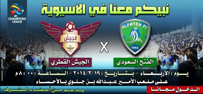 الجدير بالذكر تفاعل العديد من أعضاء شرف النادي مع الحملة الجماهيرية التي أطلقتها إدارة نادي الفتح تحت شعار (نبيكم معانا في الآسيوية) قبل مواجهة الجيش القطري والتي على أثرها ستفتح مدرجات ملعب مدينة الأمير عبدالله بن جلوي اليوم الأربعاء مجانا للجماهير الفتحاوية وستوزع تذاكر المباراة لدى بوابات الدرجة الأولى والثانية ومن جانبه تكفل عضو مجلس إدارة نادي الفتح والمشرف العام على كرة القدم أحمد الراشد بمصاريف الرابطة الفتحاوية في لقاء الجيش القطري في ثالث مواجهات الفتح الآسيوية.