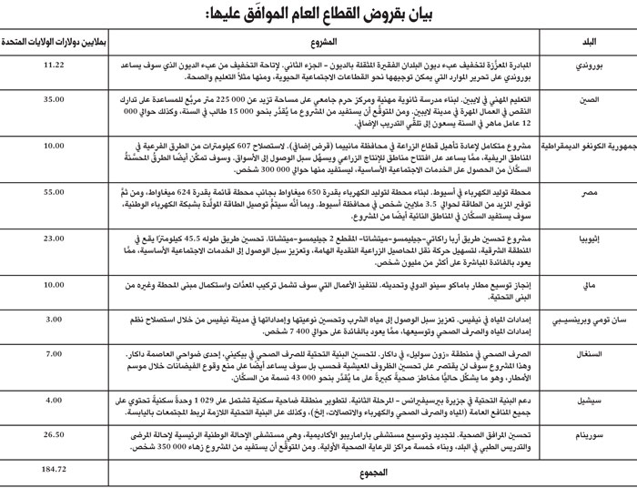 هذا وقد تمت الموافقة على سبعة مشاريع بمبلغ إجمالي قدره 70 مليون دولار في إطار برنامجي القطاع الخاص وتمويل التجارة.