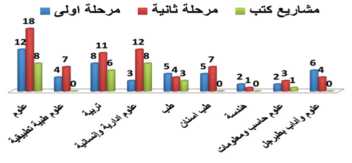 وجاءت المشروعات البحثية من مختلف كليات الجامعة تصدرتها كلية العلوم بثمانية عشر بحثاً ثم كلية العلوم الإدارية والإنسانية باثني عشر بحثاً تلتها كلية التربية بأحد عشر بحثاً ثم كلية طب الأسنان وكلية العلوم الطبية التطبيقية بسبعة أبحاث لكل منهما وكلية العلوم والآداب بطبرجل وجاءت كلية الطب بخمسة أبحاث ثم كلية علوم الحاسب والمعلومات والهندسة.