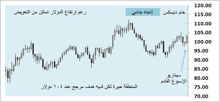 تمكن خام نايمكس من وقف نزيف البيوع عند مستوى 97 دولاراً داخل منطقة الحيرة الأسبوعية، وعمل قمة عند مستوى 100.25 دولار، وأنهى التعاملات بنمط شرائي متوسط القوة، لكن الحيرة لا تزال مستمرة على معظم الفواصل الزمنية. جاء ذلك رغم ارتفاع العملة الخضراء بسبب خفض جرعة التخفيف الكمي، ونرجح استمرار زخم الشراء إلى الأسبوع المقبل، وتشييد قمة مرجحة عند 104 دولارات، والإغلاق عند مستوى 103 دولارات.