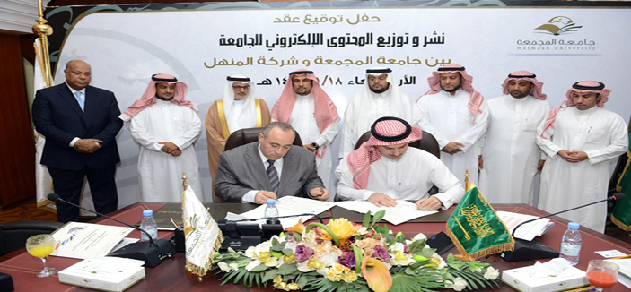 وقعت جامعة المجمعة وشركة المنهل التكنولوجية اتفاقية تعاون تهدف لنشر المحتوى العلمي والثقافي الصادر عن الجامعة وذلك بحضور مديرها الدكتور خالد بن سعد المقرن ورئيس جمعية الناشرين السعوديين نائب رئيس اتحاد الناشرين العرب الأستاذ أحمد الحمدان الوكيل الحصري لشركة المنهل التكنولوجية وقد مثل الجامعة في توقيع الاتفاقية وكيل الجامعة للدراسات العليا والبحث العلمي الدكتور محمد بن عبد الله الشايع، ومن شركة المنهل التكنولوجية مدير تطوير المحتوى محمد عطية الشافي، وبدأت مراسم التوقيع بكلمة لوكيل الجامعة للدراسات العليا والبحث العلمي رحب فيها بالحضور وتحدث عن أهمية الاتفاقية للبحوث العلميَّة والدراسات الصادرة عن الجامعة وما لها من أثر في نشر العلم والمعرفة والمساهمة في تسهيل عملية البحث العلمي تلا ذلك كلمة لمدير الجامعة رحب فيها بشراكة الجامعة مع القطاعات الحكوميَّة والأهلية وتحدث عمَّا تحقق للجامعة التي لم يتجاوز عمرها الخمس سنوات من إنجازات بفضل الدعم اللا محدود من قبل حكومة خادم الحرمين الشريفين وأشار إلى انسجام هذه الاتفاقية مع أهداف الجامعة وقيمها في العمل المنهجي وما لهذه الشراكة من المساعدة في توسع وانتشار المحتوى العلمي والثقافي لها مؤكِّدًا على حرصًا على التوسع في التَّعليم والنشر الإلكتروني الذي يمكن الطلبة والباحثين من مواكبة المستجدات العلميَّة، وزيادة قدراتهم البحثية، موضحًا أن هذه الاتفاقية سوف تسهم في تعزيز مكانة الجامعة وتقدمها نحو العالميَّة لما ستحققه من خلال نشر مجالاتها العلميَّة وإصداراتها والاستفادة منها من قبل الباحثين في جميع دول العالم بعد ذلك ألقى مدير المحتوى بشركة المنهل التكنولوجية محمد الشافي كلمة ذكر فيها أن منشورات جامعة المجمعة ستكون إضافة قيمة إلى قاعدة بيانات المنهل وموردًا قيمًا لشبكتها العالميَّة في جميع المجالات الإسلاميَّة والأدبيَّة والعلميَّة وتطرَّق للمهام التي تقوم بها الشركة في تسهيل الانفتاح والتبادل الثقافي والعلمي بين مؤسسات البحث العلمي والتَّعليم العالي والجامعات ودور النشر في العالم العربي وأنه سيتم جعل هذه المنشورات متاحة في الجامعات والمستشفيات والشركات والمكتبات العامَّة في جميع أنحاء العالم، مشيرًا إلى اشتراك أكثر من (100) جامعة بمجموعات وقواعد بيانات شركة المنهل في جميع أنحاء العالم التي تضم نحو مليوني مستخدم وباحث وبيَّن الشافأن قاعدة بيانات المنهل تتميز باستخدام أحدث التقنيات وأدوات بحث متقدِّمة واشتراكها في برنامج منع السرقة وتحديد نسبة الاقتباس لكافة الأبحاث والمقالات العلميَّة والرسائل الجامعية.