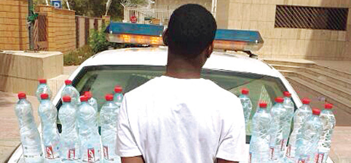 تمكَّنت دوريات الأمن بمنطقة الرياض من الإيقاع بوافد صومالي في العقد الثاني من العمر بعد تورّطه بترويج المسكر. وكان مركز العمليات الأمني قد تلقى بلاغاً من أحد المواطنين يفيد فيه بأنه شاهد شخصاً مشتبهاً في وضعه يسير على شارع منفوحة بحي البطحاء، وبناءً على ذلك فقد تم توجيه إحدى الفرق للموقع للتأكد من صحة البلاغ، وبمجرد رؤية الوافد لسيارة الدورية ارتكب الفرار جرياً على قدميه، فتمت ملاحقته وسد كافة المنافذ أمامه لمنعه من الهروب حتى تمت السيطرة عليه، فتم الرجوع به إلى الموقع الذي هرب منه وتفتيش أرجائه تفتيشاً دقيقاً فعثر فيه على تسع عشرة قارورة مملوءة بمادة العرق المسكر.