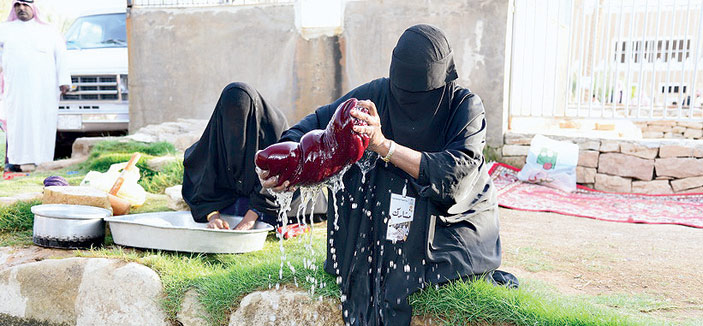 تجمهر عدد كبير من الزوار أمام ركن غسل الملابس بطريقة الجدات في ملتقى الحرفيين الأول في متنزه النزل الريفي بعنيزة، والذي ينظمه مركز التنمية الاجتماعية.. حيث جسدت المرأة وبكل حرفية صورة الجدات اللواتي كن يغسلن الملابس قديماً بالرغم ما فيها من مشقة في الحصول على الماء ومواد التنظيف إلاّ أنها كانت حياة جميلة.