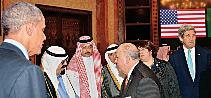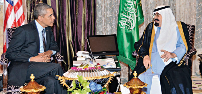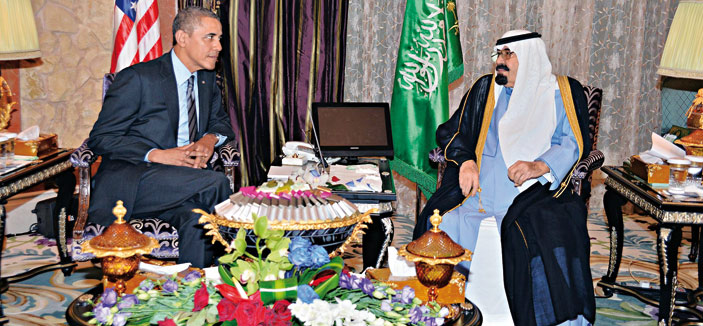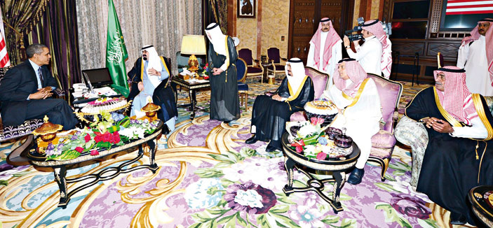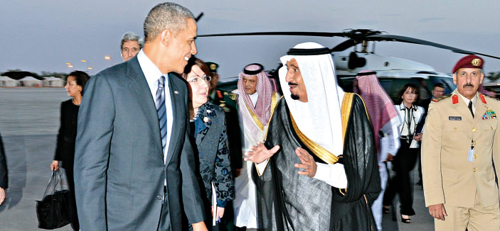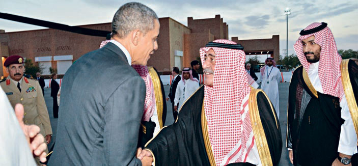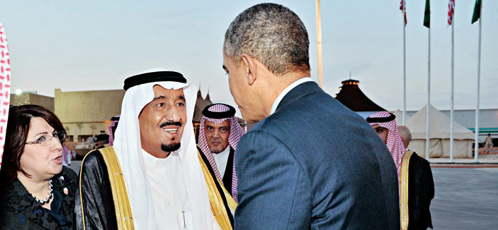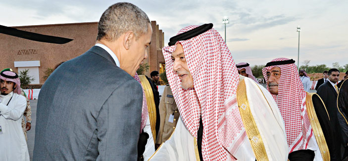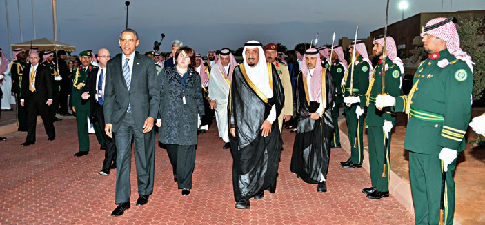 استقبل خادم الحرمين الشريفين الملك عبدالله بن عبدالعزيز آل سعود -حفظه الله- في روضة خريم، أمس، فخامة الرئيس باراك أوباما رئيس الولايات المتحدة الأمريكية والوفد المرافق له. وقد أجريت لفخامته مراسم استقبال عند وصوله إلى روضة خريم، حيث كان في استقباله عند باب الطائرة المقلة له صاحب السمو الملكي الأمير سلمان بن عبدالعزيز آل سعود ولي العهد نائب رئيس مجلس الوزراء وزير الدفاع، وصاحب السمو الملكي الأمير سعود الفيصل وزير الخارجية، وصاحب السمو الملكي الأمير مقرن بن عبدالعزيز آل سعود ولي ولي العهد النائب الثاني لرئيس مجلس الوزراء وصاحب السمو الملكي الأمير محمد بن سلمان بن عبدالعزيز رئيس ديوان سمو ولي العهد المستشار الخاص لسموه. بعد ذلك صحب سمو ولي العهد فخامة الرئيس الضيف إلى مقر خادم الحرمين الشريفين، حيث صافحه الملك المفدى مرحباً به وبمرافقيه في المملكة العربية السعودية.