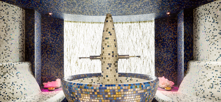 ويتميز سبا الفيصلية بإدارة ESPA بديكور راق من كريستال شواروفسكي والستائر المائية، وهذا يضيف إلى المكان رونقاً خاصاً، وهو من إبداعات «شركة جوام للتصميم» لصاحبة السمو الأميرة العنود بنت خالد بن عبدالله آل سعود، حيث تم تزويده بالكثير من عناصر الرفاهية المترفة عبر قطع من الأثاث الفاخر، والزخارف الملهمة وتكشيلات رائعة من النافورة الثلجية والستارة المائية التي تكون معاً لوحة فنية ساحرة.