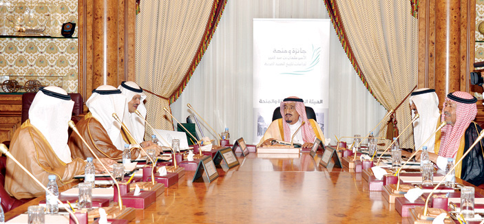 رأس صاحب السمو الملكي الأمير سلمان بن عبدالعزيز آل سعود ولي العهد نائب رئيس مجلس الوزراء وزير الدفاع رئيس مجلس إدارة دارة الملك عبدالعزيز رئيس الهيئة العليا لجائزة ومنحة الأمير سلمان بن عبدالعزيز لدراسات وبحوث تاريخ الجزيرة العربية في مكتبه بالرياض أمس اجتماع الهيئة العليا للجائزة والمنحة بحضور أعضاء الهيئة العليا .