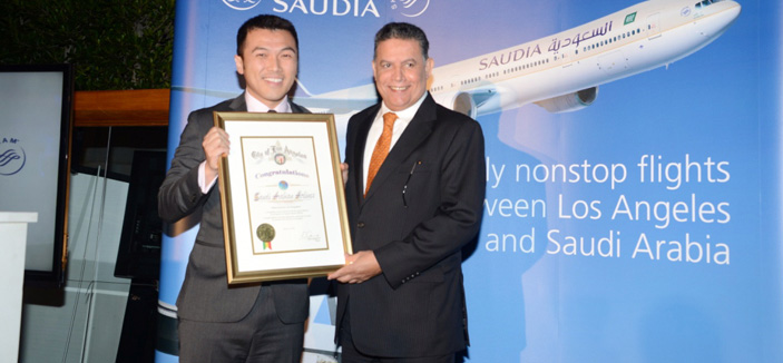 انجلوس، بحضور قنصل سفارة خادم الحرمين الشريفين بلوس انجلوس الدكتور فيصل السديري وسمو الأمير الأمير سلطان بن سعد آل سعود نائب القنصل العام، وممثل عمدة مدينة لوس انجلويس ومدير التجارة الدولية السيد ستيفن تشيونغ واستعرض الحازمي بحضور رجال الأعمال والدبلوماسيين وعدد من مسؤولي الطيران والسياحة والطلبة بأمريكا، موجزاً عن إنجازات «السعودية» في أمريكا الشمالية التي تضم محطات واشنطن ونيويورك وتورنتو بكندا، مبيناً أن «السعودية» نقلت 257,963 مسافراً بين المملكة وأمريكا الشمالية خلال 2013م بزيادة 49.4 % مقارنة بالعام الذي سبقه، مشيراً إلى أن حركة النقل الجوي بين المملكة وأمريكا خلال الربع الأول من 2014م حققت قفزة كبيرة، حيث زادت نسبة نمو السفر إلى أكثر من 55% مقارنة بنفس الفترة من العام الماضي، حيث بلغ إجمالي المنقولين خلال يناير وفبراير ومارس من هذا العام بين المملكة وأمريكا الشمالية 89,988 مسافراً وذلك على متن 444 رحلة، كما ألقى السيد ستيفن تشيونغ كلمة عبر فيها عن سعادته بحضور المناسبة التي وصفها بالرائعة، مشيراً إلى أنها ستساهم في دفع العلاقات الثنائية بين المملكة وأمريكا وتسهل حركة النقل الجوي بين البلدين الصديقين، بعد ذلك تم تبادل الهدايا التذكارية، كما تجول الجميع في المعرض المصاحب الذي يبرز الخدمات الجديدة التي تقدمها «السعودية» على متن الطائرة، بعد ذلك التقطت الصور التذكارية بهذه المناسبة.