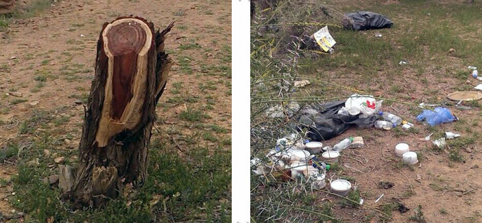 عدسة «الجزيرة» تجولت في المتنزهات الطبيعية القريبة من بلدة توارن التاريخية «منتزهات الشعبين والميضاحة»، والتي شهدت إقبالا كبيراً وحركة كثيفة من السياح خلال الأيام الماضية، والتقطت صور النفايات المتراكمة في تلك المواقع وعبث مرتادي تلك المواقع في أشجار الطلح، وتشويه الطبيعة فيها.