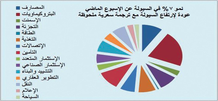 مؤشر القطاع المصرفي على عتبة 20000 نقطة، والميول تتجه نحو قمة جديدة مع توقعات بنمو صافي أرباح القطاع للربع الأول 7 %؛ ما سيدعم من موقف المشترين في السوق، ويرجح أن يكون هناك نمو للسيولة تعلو 10 مليارات ريال تقريباً، وسيكون أسبوعاً ساخناً بأرقام البنوك تحديداً. ومما لوحظ مؤخراً أن أسعار الأسهم لا تنحني كثيراً أمام التوزيعات النقدية والأسهم المجانية؛ ما يعطي انطباعاً قوياً بأن السوق تحت سيطرة المشترين.