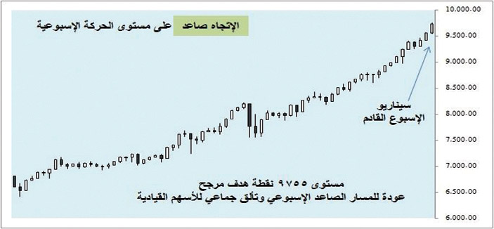 افتُتح السوق على هبوط إلى مستوى 9419 نقطة بعزم ضعيف جداً، يليه ارتداد مصحوب بقمة جديدة عند مستوى 9572 نقطة، وإنهاء الأسبوع بنمط شرائي جيد أعاد السوق للمسار الصاعد على مستوى الحركة الأسبوعية. وكان الدعم من معظم مكونات السوق، منها سابك التي تمكنت من الإغلاق عند 118 ريالاً بعد أن غادرت هذا المستوى منذ أواخر يناير الماضي بعد انتهاء إعلانات الموسم الأول للنتائج المالية من هذا العام، وهو سلوك معتاد.