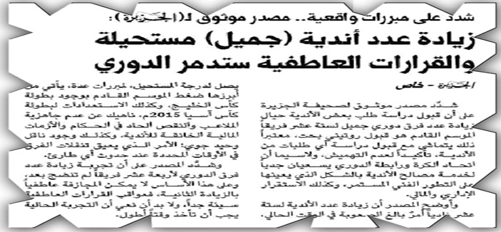 بإعلانه الرسمي عن عدم زيادة أندية دوري جميل للموسم الكروي المقبل صادق رئيس اتحاد الكرة أحمد عيد الحربي على الانفراد المهني الذي حملته صفحات (الجزيرة) المتضمن تصريحاً لمصدر موثوق حول عدم زيادة الفرق واستحالة ذلك لمبررات كثيرة الذي نشر قبل نحو أسبوعين في ظل تنامي الأحاديث حول زيادة مرتقبة..