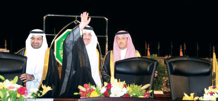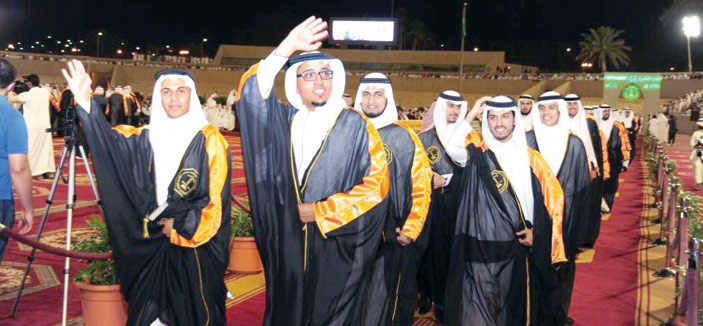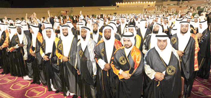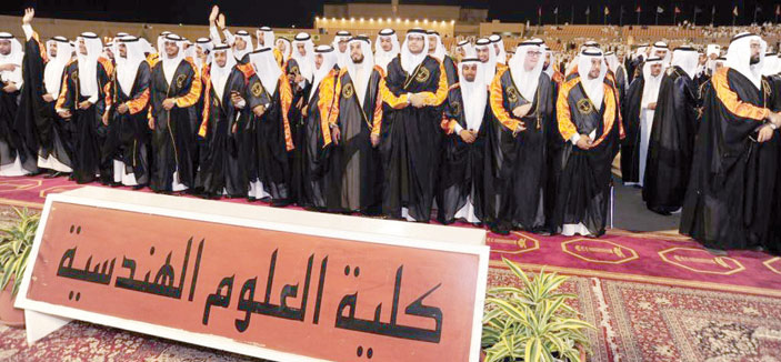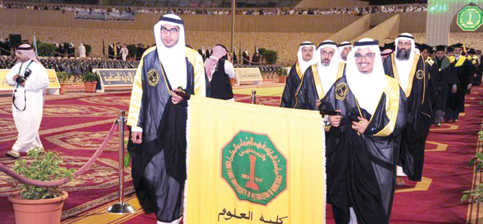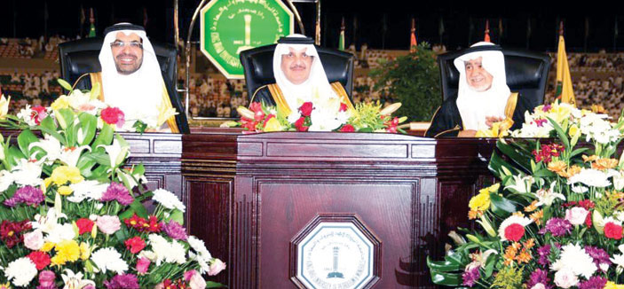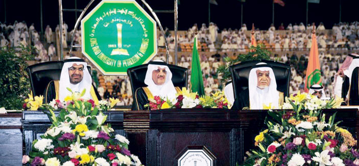 وقال: لقد تخرجتم في جامعة قدمت للوطن الغالي خريجين متميزين شغلوا مواقع قيادية في مختلف مواقع العمل على امتداد وطننا الحبيب، وأكدوا - بأدائهم الراقي وعطاءاتهم المتميزة - ارتفاع مستوى برامج الجامعة، وقدموا عطاءات علمية ومعرفية كان لها أثرها البالغ في النهوض بالمجتمع، وكان كل ذلك محصلة طبيعية للدعم المادي والمعنوي الكبير الذي تقدمه للتعليم العالي حكومتنا الرشيدة بقيادة خادم الحرمين الشريفين الملك عبدالله بن عبدالعزيز وسمو ولي عهده الأمين الأمير سلمان بن عبدالعزيز وسمو ولي ولي العهد النائب الثاني الأمير مقرن بن عبدالعزيز - حفظهم الله. لقد كان لوعي الجامعة بأهمية الربط بين تخصصاتها واحتياجات سوق العمل، وتطويرها وعلاقاتها المتميزة مع قطاعات الإنتاج والخدمات، وارتباطها بمسارات تعاون قوي مع جامعات ومراكز علمية عالمية، وحرصها على تقويم برامجها من هيئات اعتماد عالمية، واستقطابها أعضاء هيئة تدريس متميزين، وكذلك اهتمامها بالبحث العلمي والتقني، وإنجازها برامج طموحة لزيادة البحث والابتكار، وتشجيعها أعضاء هيئة التدريس والطلاب على القيام بالبحوث والدراسات.