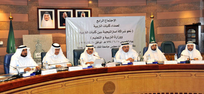 برعاية معالي وزير التعليم العالي الدكتور خالد العنقري، عقد بقاعة مجلس جامعة الملك عبدالعزيز اجتماع عمداء كليات التربية (الرابع)، بعنوان (نحو شراكة استراتيجية بين كليات التربية ووزارة التربية والتعليم). وقد عقد الاجتماع بحضور معالي نائب وزير التعليم العالي أحمد السيف، ومعالي نائب وزير التربية والتعليم للبنين الدكتور حمد آل الشيخ، ومعالي مدير جامعة الملك عبدالعزيز الأستاذ الدكتور أسامة طيب، ووكيل الجامعة للشؤون التعليمية ووكيل وزارة التعليم العالي للشؤون التعليمية ووكيل وزارة التربية والتعليم للبنين ووكيل وزارة التربية والتعليم للتخطيط والسياسات وأعضاء اللجنة الدائمة لتعزيز الشراكة بين وزارتَيْ التعليم العالي والتربية والتعليم وعمداء كليات التربية.