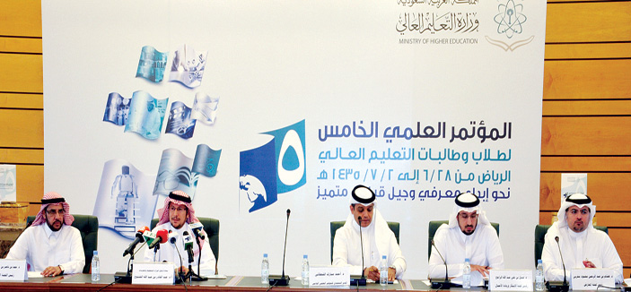 ورفع د. الفنتوخ شكره لمقام خادم الحرمين الشريفين الملك عبدالله بن عبدالعزيز آل سعود -أيده الله- على رعايته الكريمة للمؤتمر التي تدل على دعمه الكبير لقطاع التعليم العالي، والاهتمام الكبير الذي يوليه، حفظه الله، لأبنائه وبناته طلاب وطالبات التعليم العالي، كما شكر معالي وزير التعليم العالي الدكتور خالد بن محمد العنقري ومعالي نائبه الدكتور أحمد بن محمد السيف على دعمهم ومتابعتهم لكافة أنشطة المؤتمر، وكذلك كافة العاملين في المؤتمر على الجهود التي يبذلونها في سبيل إنجاح فعالياته، وقال:إن الإضافة المميزة التي يتضمنها المؤتمر في دورته الخامسة تتمثل في الاهتمام الكبير بمحور الابتكار وريادة الأعمال الذي يعد المحور الأول في هذه الدورة، بالإضافة إلى محاور البحث في العلوم الصحية، والعلوم الأساسية والهندسية، والعلوم الإنسانية، مضيفاً أنه سيصاحب المؤتمر تنظيم أكبر معرض للابتكارات وريادة الأعمال في تاريخ المملكة، مضيفاً أن الاهتمام بهذا المحور يأتي في إطار اهتمام الدولة بالتحول نحو اقتصاد المعرفة، وتنويع مصادر الدخل، والاهتمام بتنمية ثقافة الإبداع والابتكار في المجتمع، مضيفاً أنه في إطار هذا التوجه؛ أطلقت وزارة التعليم العالي حملة تثقيفية للابتكار وريادة الأعمال، تحت شعار (أفكار.. ريادة وابتكار)، تستمر فعالياتها حتى نهاية شهر جمادى الآخرة، وتسعى الحملة لإيصال رسالة المؤتمر المتضمنة الانتقال من مفهوم الطالب المتلقي إلى الطالب المنتج، عبر خلق روح المنافسة بين الطلاب في منتجاتهم العلمية والابتكارية، وتتكون الحملة من قوافل تثقيفية تستهدف الجامعات في مختلف مناطق المملكة وتتجول في الميادين العامة والأسواق، كما تشمل إقامة العديد من الفعاليات والبرامج التثقيفية من ورش عمل ومحاضرات.