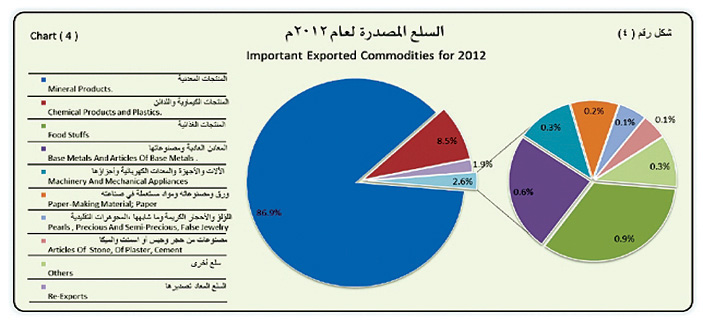 حتى الآن لا تزال الصورة الحقيقية لواقع المملكة النفطي غير موضح بما تستحقه المملكة من ريادة واستحقاق عالمي.. فالمملكة ينبغي إبراز هويتها النفطية كمحور قوة اقتصادية، ولكن لسوء الحظ اختلاط الحديث حول التنويع الاقتصادي عزى بالكثيرين من الهروب من هذه الحقيقة والريادة الاقتصادية، والعالمية للمملكة في إنتاج وتصدير النفط الخام وأيضا في إنتاج وتصدير المنتجات النفطية.. فالمملكة تصل نسبة المنتجات المعدنية (النفط والغاز) فيها من إجمالي صادراتها إلى نحو 86.0 في المائة.. ولما نعلم أن حجم هذه الصادرات السعودية وصل في عام 2012م إلى نحو 1457 مليار ريال، يتضح مدى ضخامة الحديث عن نسبة 87 في المائة صادرات من النفط والغاز.. تليها المنتجات الكيماوية واللدائن بنسبة مساهمة في الصادرات بنحو 8.5 في المائة.. أي أن المنتجات النفطية (الخام والمصنعة) تساهم في الصادرات السعودية بنسبة 95.5 في المائة من إجمالي الصادرات، وبقيمة تصل إلى 1350 مليار ريال في عام 2012م.