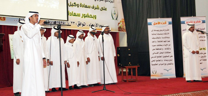 وبعد صلاة الظهر بدأ الحفل الخطابي على شرف وكيل الوزارة لتعليم البنين بحضور محافظ الأفلاج وعدد من رؤساء ومديري الدوائر الحكومية، بآي من الذكر الحكيم، ثم توالت بعد ذلك فقرات الحفل، وشملت عرضا مرئيا عن أهم مبادرات و مشاريع الإدارة خلال الخمس السنوات الماضية، من إنتاج قسم الإعلام التربوي. ثم كلمة مدير التربية و التعليم الأستاذ محمد بن مبارك الزايد بهذه المناسبة ثم ألقى رئيس قسم التوجيه والإرشاد الأستاذ خالد المحيميد كلمة تناول فيها الحديث حول المشروع التربوي «أنت الأمل».
