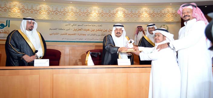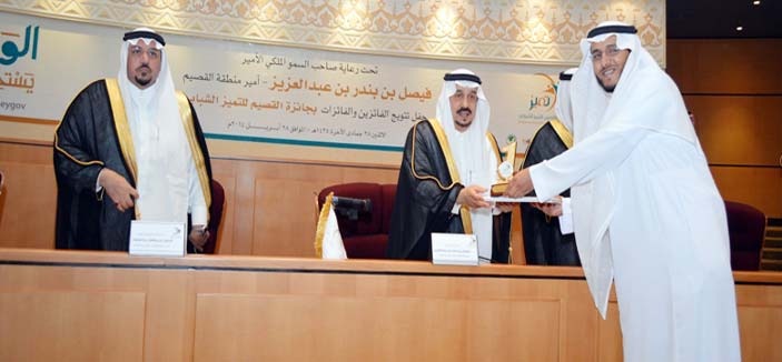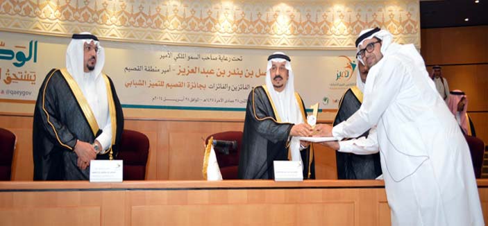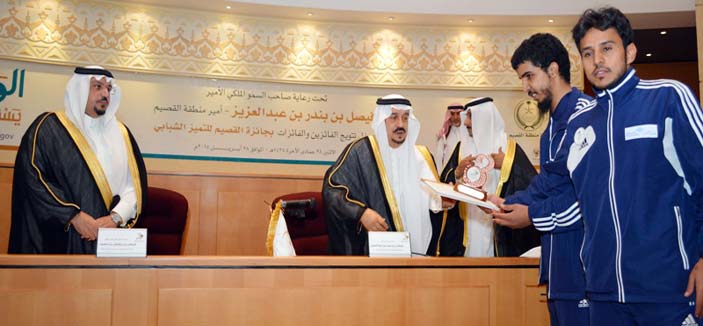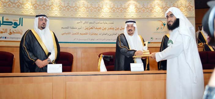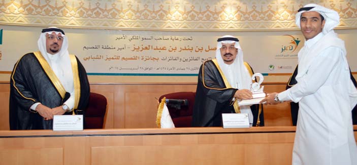 توَّج صاحب السمو الملكي الأمير فيصل بن بندر بن عبد العزيز، أمير منطقة القصيم رئيس مجلس الأمناء لجائزة التميُّز الشبابي بالقصيم مساء أمس الأول الفائزين والفائزات بالجائزة، وذلك في قاعة المؤتمرات في إمارة المنطقة بمدينة بريدة, بحضور صاحب السمو الملكي الأمير الدكتور فيصل بن مشعل بن سعود بن عبد العزيز - نائب أمير منطقة القصيم - ومحافظي المحافظات وعدد من الأعيان ورجال الأعمال والمسئولين.