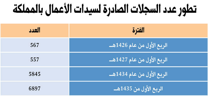 قوة الطلب المحلي لم تتجه ناحية السجلات التجارية للرجال فقط، ولكن ظهرت تأثيرات أيضاً على سجلات سيدات الأعمال، ففي الربع الأول من هذا العام (1435هـ) بلغ عدد السجلات الصادرة لسيدات الأعمال حوالي 6897 سجلاً، مقابل حوالي 5845 سجلاً في الربع الأول من العام الماضي، وهذه الأرقام تمثل قفزة قوية عن مثيلاتها منذ عشرة سنوات، حيث لم يكن عدد السجلات النسائية يتجاوز حوالي 557 سجلاً في الربع الأول من عام 1427هـ.
