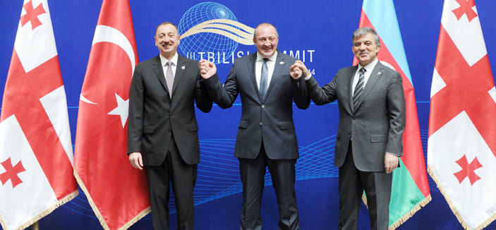 - الرئيس التركي عبدالله غول بجانب رئيس جورجيا و ورئيس أذربيجان .