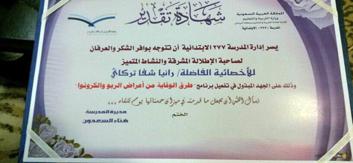 وبمشاركة وإشراف الأستاذة خيريه محمد الحازمي رائدة النشاط بالابتدائية 277 حيثُ بدأ البرنامج بشرح طرق الوقاية من مرض الربو والكورونا وذلك عن طريق الشرح والعرض المرئي عن الأسباب والعلاج أمام الطالبات كما تحدثت المُحاضرة عن مشاكل سوء التغذية ومناقشتهنّ في ذلك وقد حضر البرنامج طالبات الصف الرابع والخامس والسادس ومجموعه من أمهات الطالبات ومنسوبات المدرسة والمرشده الطلابية والإداريات والمعلمات وفي نهاية البرنامج تم توزيع نشرات على الحاضرات للفائدة وتكريم الأستاذة رانيا تركاي من قبل مديرة المدرسة الأستاذة هناء السعدون.