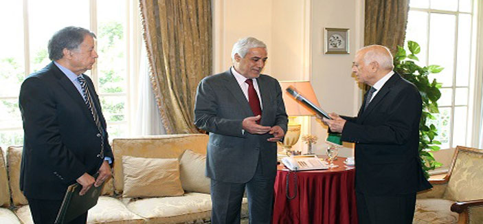 سلم التقرير الدكتور نبيل العربي الأمين العام لجامعة الدول العربية والسفير محمد صبيح رئيس بعثة الجامعة لمندوب الجزائر لدى الجامعة العربية السفير نذير العرباوي وذلك بمقر الأمانة العامة للجامعة.