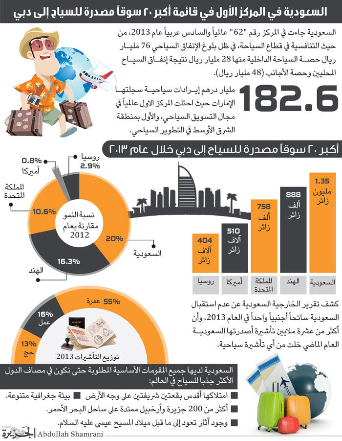 وفي أمريكا أصدرت وزارة التجارة الأمريكية تقريراً رسمياً يضع السعودية الأولى عربياً والثانية عالمياً بعد الصين في عدد السياح عام 2013 بزيادة قدرها 191%، عن عام 2012.