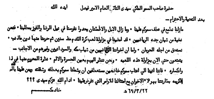 ضوئية تاريخية تتضمن خطابا من مؤسس الاتحاد الراحل حمزة فتيحي موجه إلى سمو نائب جلالة الملك في الحجاز (الملك فيصل) -رحمه الله - في 22-3-1369هـ, يطلب فيه السماح بمزاولة كرة القدم بعد إيقاف الرياضة من عام 1359 إلى 1369هـ, حيث أوضح في خطابه إن شباب جدة الرياضيين امضوا في مزاولة كرة القدم سنين ثم حرموا منها بعد قرار إيقاف الرياضة طالبا أن يشملهم بعطفه وشفقته, بعد التوقف التاريخي عشرة أعوام, وأخيرا سمح بعودتها بعد أن تعهد كل من رموز الاتحاد .. عبد العزيز جميل وعبد الله بن زفر وحمزة فتيحي وعبدالرزاق عجلان -رحمهم الله جميعا- بعدم إثارة أي فوضى ومراعاة القيم والأدب والسلوك العام, وقد ساهم الامير الراحل عبد الله الفيصل -رحمه الله- رائد الحركة الرياضية الأول .. في عودة الرياضة بالمنطقة الغربية بعد أن عالج الأزمة بوعي وحكمة وكياسة.. في أواخر عام 1369هـ.