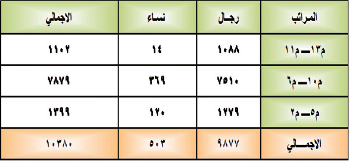 ومن جهة أخرى بينت إحصائية أصدرتها وزارة الخدمة المدنية عن عدد الموظفين المرقين خلال فترة الستة أشهر الماضية خلال الفترة من 01-01-1435هـ وحتى 01-07-1435هـ، بلغ عددهم 10380 منهم 9877 موظفاً و503 موظفات، توزعوا على جميع المراتب الوظيفية من الثالثة عشرة وحتى الثانية، حيث تصدرت المراتب الوظيفية من السادسة وحتى العاشرة الأعلى ترقية، حيث وصلت إلى 7510 موظفين و 369 موظفة.