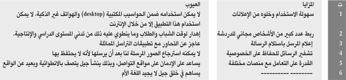 وأخيرا وليس آخرا يلخص الجدول رقم 2 مزايا وعيوب هذا التطبيق الشائع الاستخدام في عالمنا العربي، ووصل الحال ببعضهم إلى عشقه والإدمان على استخدامه.