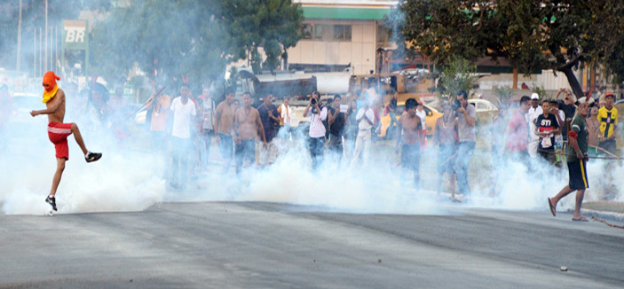 أطلقت الشرطة الغاز المسيل للدموع لتفريق محتجين رافضين لكأس العالم حاولوا الخروج في مسيرة إلى استاد كرة القدم في برازيليا حيث كان كأس البطولة معروضاً للجماهير.
