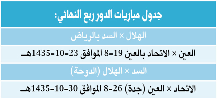 أسفرت قرعة ربع نهائي دوري أبطال آسيا لكرة القدم التي سُحبت الأربعاء في كوالالمبور عن مواجهتين مكررتين الأولى بين الهلال السعودي والسد القطري، والثانية بين العين الإماراتي والاتحاد السعودي.