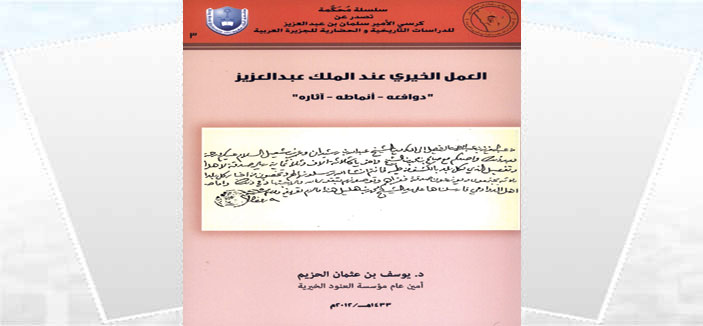ضمن سلسلة محكمة تصدر عن كرسي الأمير سلمان بن عبدالعزيز للدراسات التاريخية والحضارية للجزيرة العربية صدر كتاب (العمل الخيري عند الملك عبدالعزيز) تأليف الدكتور يوسف بن عثمان الحزيم .. وتناول البحث دوافع الملك عبدالعزيز للعمل الخيري وهي: الدافع الديني، والدافع الفطري، ودافع الجماعة.