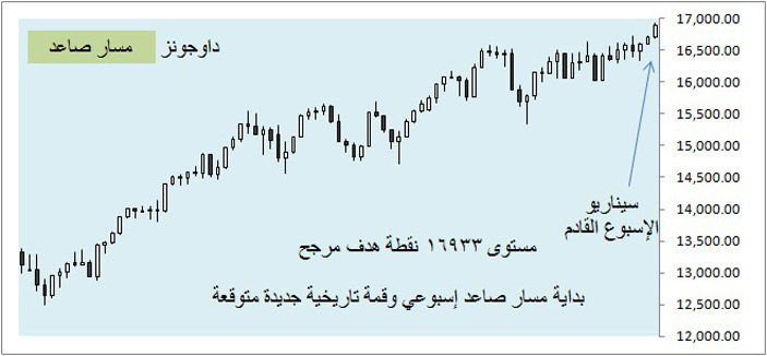 مؤشر الداوجونز تعرض لعمليات جني أرباح إلى مستوى 16607 نقطة وارتداد إلى مستوى 16721 نقطة وإنهاء الأسبوع بنمط شرائي وبداية مسار صاعد أسبوعي متوقع أن يستمر لتشييد قمة تاريخية جديدة عند مستوى 16933 نقطة بنمط شرائي قوي، والملاحظ على مؤشر الداوجونز أنه طور منطقة حيرة عظمى تتسع لألفي نقطة خلال بضعة شهور ماضية ولو تَغلَّب المشترين سيكون هناك قمم جديدة تقترب من حاجز العشرين ألف نقطة.