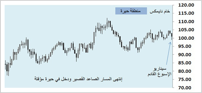 تم وأد المسار الصاعد الأسبوعي ودخل نايمكس في منطقة حيرة متعبة للتجار ولا تزال النظرة على المدى المتوسط استمرارًا لأنماط وسلوكيات حيرة مُتعدِّدة ومتنوعة لكن سيظلُّ الحاجز المئوي مؤشرًا نفسيًّا حيث التداول فوقه يرفع من معنويات المشترين والعكس دونه للبائعين، ومُرجّح الأسبوع المقبل أن تتم عملية اختبار للدعم الفني 99 دولارًا وإنهاء الأسبوع بنمط بيعي متوسط القوة ولا ننسى قوة الدولار هذه الأيام سترفع تكلفة البرميل.