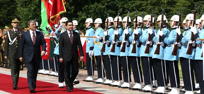 - الرئيس التركي عبدالله غول بجانب رئيس تركمانستان أثناء استقباله في العاصمة التركية أنقرة ... أ ف ب
