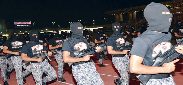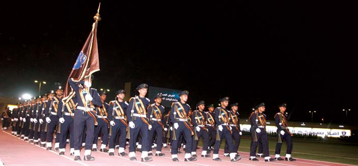 ثم أدى الخريجون طابور العرض لأداء تشكيل شعار الدولة، وشكَّل الطلاب بأجسادهم شعار (نايف في قلوبنا) عرفاناً منهم بجهود صاحب السمو الملكي الأمير نايف بن عبد العزيز آل سعود - رحمه الله - في تحقيق الأمن.