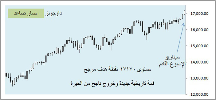 تمكن مؤشر الداوجونز من الخروج من منطقة الحيرة على المدى المتوسط مشيداً قمة تاريخية جديدة عند مستوى 16924 نقطة ومعززاً من المسار الصاعد بنمط شرائي اسبوعي قوي، ولا تزال السياسة المالية والنقدية الأمريكية تدعم هذا الصعود وتعزز من موقف المشترين، ويتوقع الاسبوعي المقبل أن يتم تشييد قمة تاريخية جديدة عند مستوى 17170 نقطة وإكمال للمسار الصاعد على مستوى الحركة الاسبوعية والشهرية .