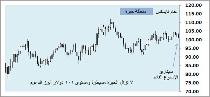 خام نايمكس لم يحرك ساكناً هذا الإسبوع حيث اكتفى بتذبذب بقيمة دولارين تقريباً داخل منطقة حيرة اسبوعية حيث الاتجاه مفقود حالياً وشهية المخاطرة متجهه فقط لأسواق الأسهم بعد عدة قرارات بشأن أسعار الفائدة، ويرجح الاسبوع القادم أن لا يتغير كثيراً هذا السلوك رغم ضعف الذهب وانخفاض تكلفة البرميل بانخفاض العملة الخضراء وعليه سيكون مستوى 101 دولار دعم فني والحاجز المئوي دعم نفسي للمشترين فوقه.