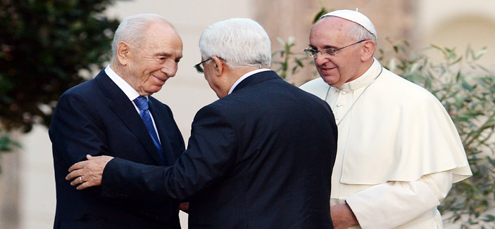 بناء على دعوة مفاجئة من البابا فرنسيس أثناء زيارته للأراضي المقدسة الشهر الماضي التقى الرئيس الفلسطيني محمود عباس والرئيس الاسرائيلي شمعون بيريس في مدينة الفاتيكان أمس الأحد في أول صلاة هي الأولى من نوعها تضم يهوداً ومسيحيين ومسلمين في حدائق الفاتيكان وهي أول مرة أيضاً يلتقي فيها عباس وبيريس علناً منذ أكثر من عام،كما شهد هذا اللقاء أول تلاوة للقرآن الكريم في مبنى الفاتيكان. ودعا البابا الجانبين إلى التحلي بـ(الشجاعة) لصنع السلام وقال امام عباس وبيريز في حديقة الفاتيكان حسب الترجمة العربية الرسمية لكلمته ان (صنع السلام يتطلب شجاعة تفوق بكثير شجاعة خوض الحروب ... نحتاج الى الشجاعة لنقول نعم للقاء ولا للصدام نعم للحوار ولا للعنف، نعم للتفاوض ولا للعداوة، نعم لاحترام المعاهدات ولا للاستفزازات ، نعم للصدق ولا للازدواجية).